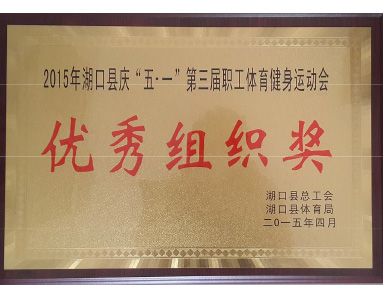 湖口縣總工會(huì)、湖口縣體育局聯(lián)合授予“2015年湖口縣慶五一第三屆職工體育健身運(yùn)動(dòng)會(huì)優(yōu)秀組織獎(jiǎng)”榮譽(yù)