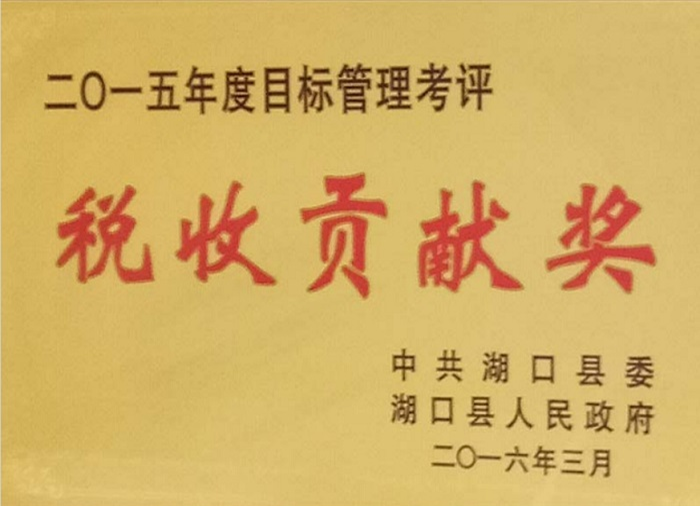 中共湖口縣委、湖口縣人民政府聯(lián)合授予“2015年度目標(biāo)管理考評(píng)稅收貢獻(xiàn)獎(jiǎng)”榮譽(yù)